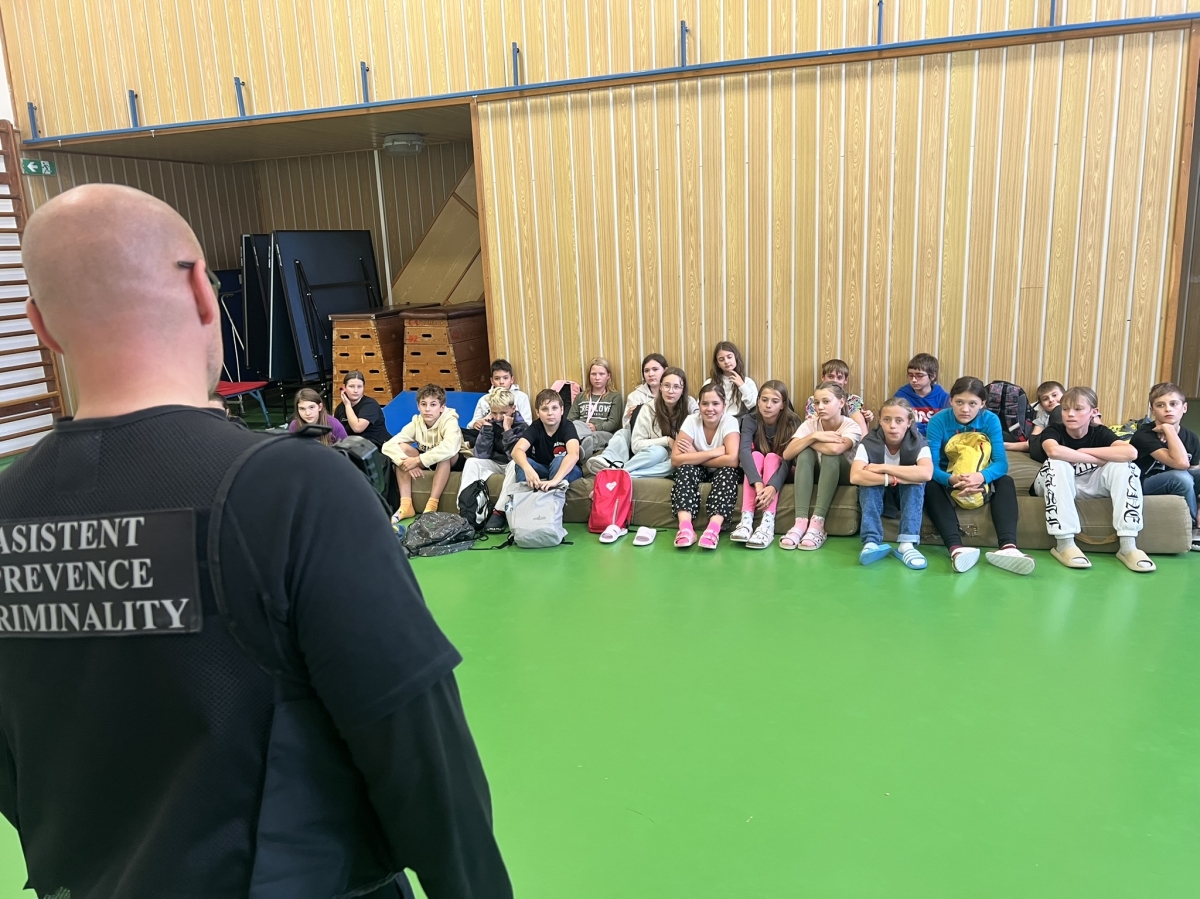 Na prvním stanovišti probíhala beseda na téma „Bezpečnost kolem nás“. Strážníci s dětmi diskutovali o tom, jak se chovat v různých rizikových situacích – například při kontaktu s neznámými osobami, při pohybu v dopravním provozu nebo jak správně volat linku tísňového volání. Žáci měli možnost klást otázky a sdílet své zkušenosti z běžného života.