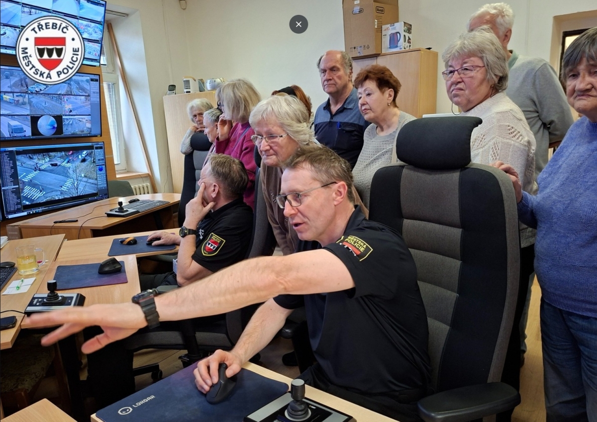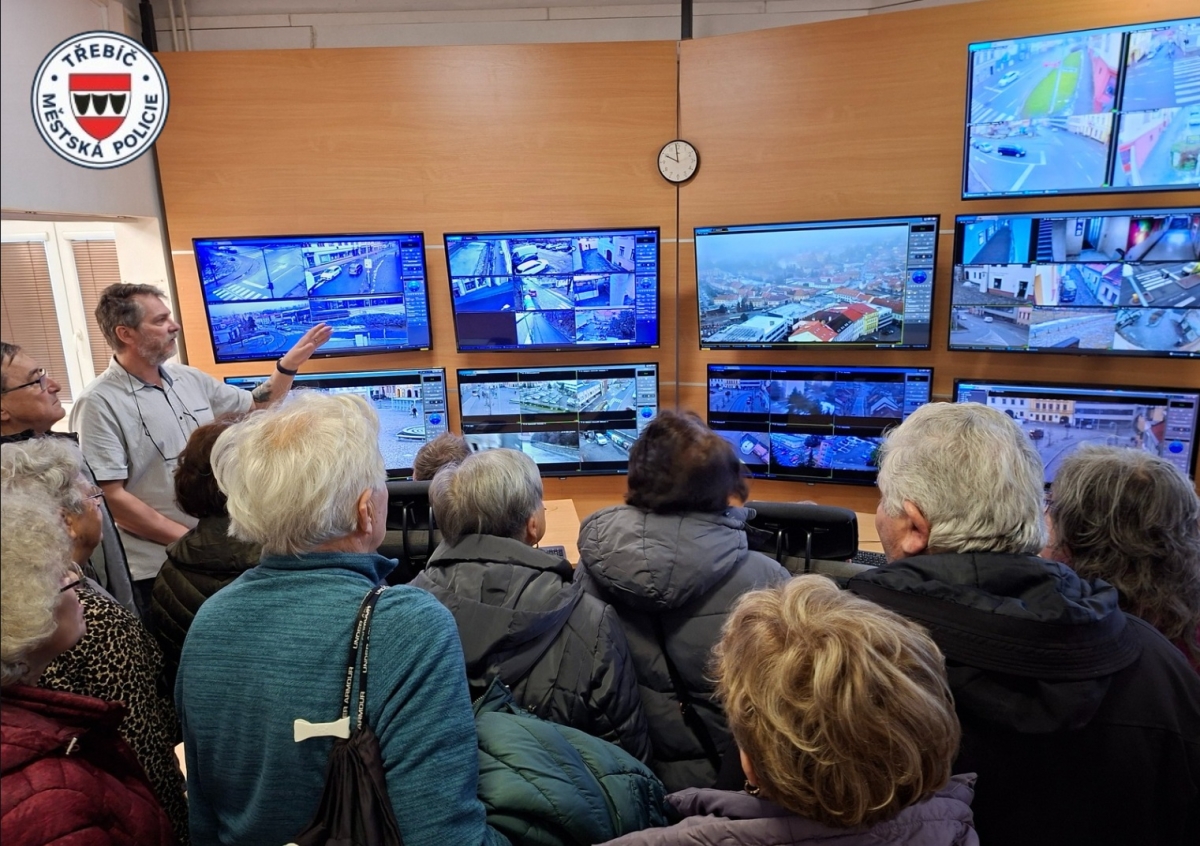 Třebíčští senioři zapojení do 10. ročníku projektu Senior Akademie navštívili v rámci exkurze Městskou policii Třebíč. Cílem návštěvy bylo operátorské pracoviště městského kamerového dohledového systému, kde se účastníci seznámili s moderními technologiemi chránícími bezpečí obyvatel. Technik komunikačních systémů provedl seniory historií i současností kamerového dohledu a představil technické novinky, které pomáhají nejen při odhalování kriminality ve městě. Velký zájem vzbudila praktická část prohlídky – účastníci si mohli na vlastní kůži vyzkoušet práci operátorů a sami si otestovali ovládání jednotlivých kamer. Projekt Senior Akademie realizuje Městská policie Třebíč za finanční podpory Kraje Vysočina ve spolupráci se Senior Pointem Třebíč. Celoroční program nabízí přednášky zaměřené na prevenci kriminality a bezpečnost, ale také kurzy základů práce s počítačem. Na nadcházející přednášce se účastníci seznámí i s tématem umělé inteligence – jejím přínosem i možnými riziky. Zájemci o účast na budoucích přednáškách a vzdělávacích aktivitách se mohou obrátit na pracovníka Senior Pointu Třebíč, pana Pavla Šabatku, který poskytne bližší informace: tel.: 568 896 263, e-mail: pavel.sabatka@trebic.cz.